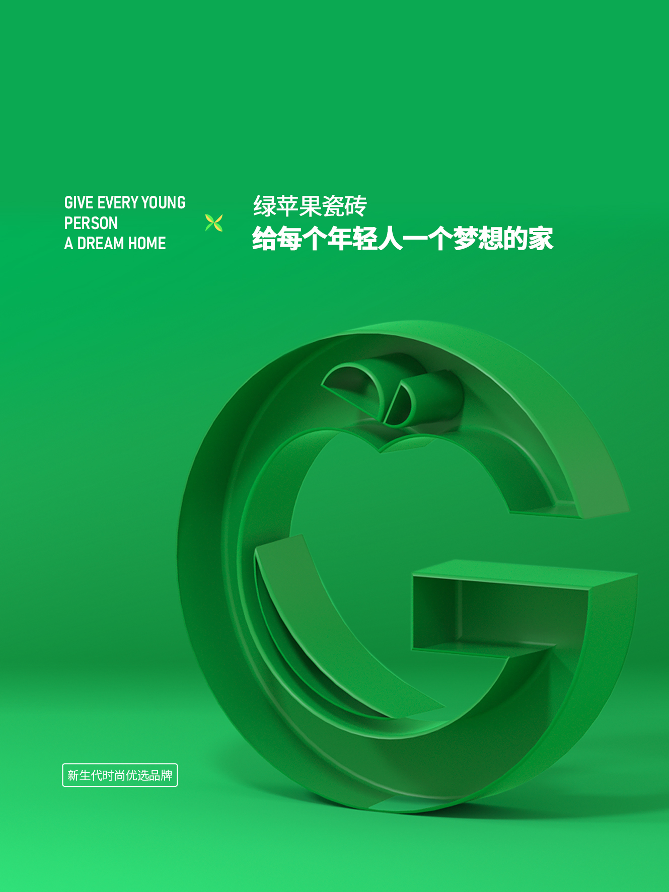 新生代品牌瓷磚綠蘋果瓷磚GREEN APPLE 始于2010年,糅合潮流元素與多變格調,優選品質好物,用顛覆創新的思維去組合夢想空間,打造時尚、激情、富有情感互動的理想家,其中張揚著年輕、奮斗和快樂的DNA。產品集合國際潮流色彩,以“給每個年輕人一個夢想的家”為品牌使命,傳遞正青春的簡單理念和細膩入微的質感精神。